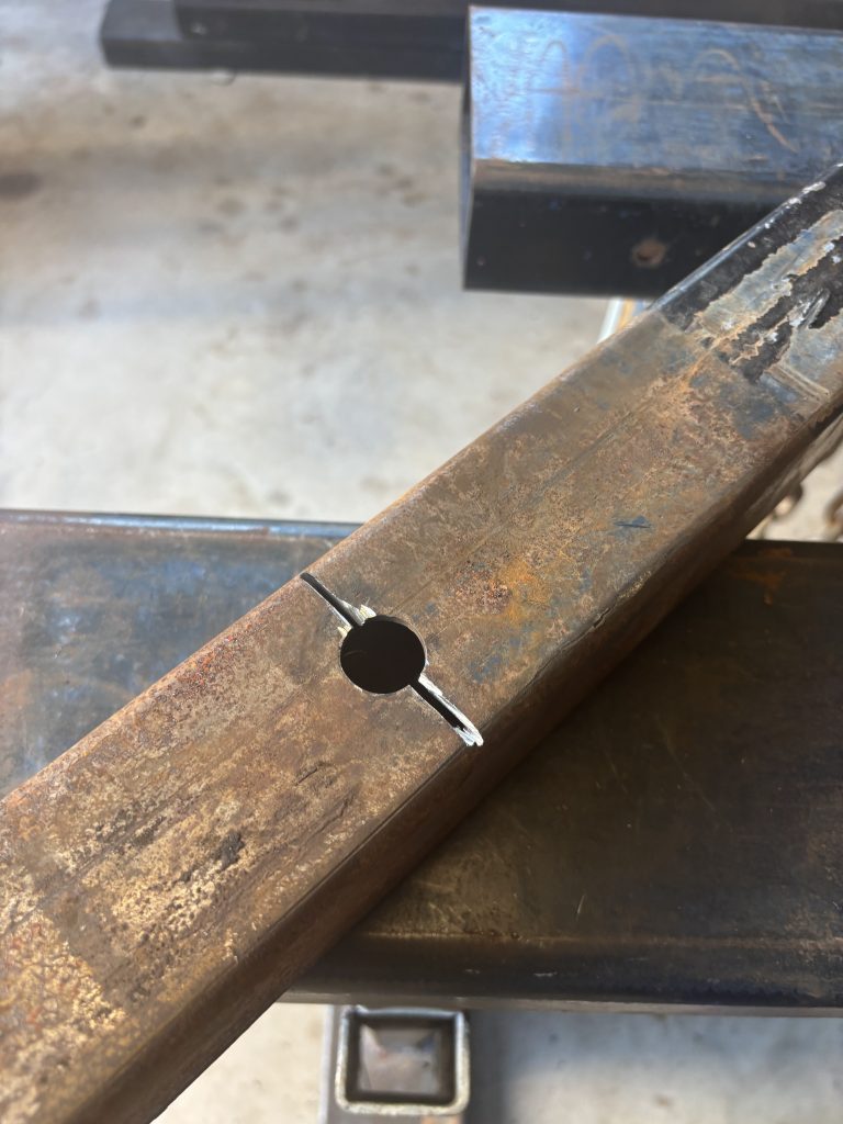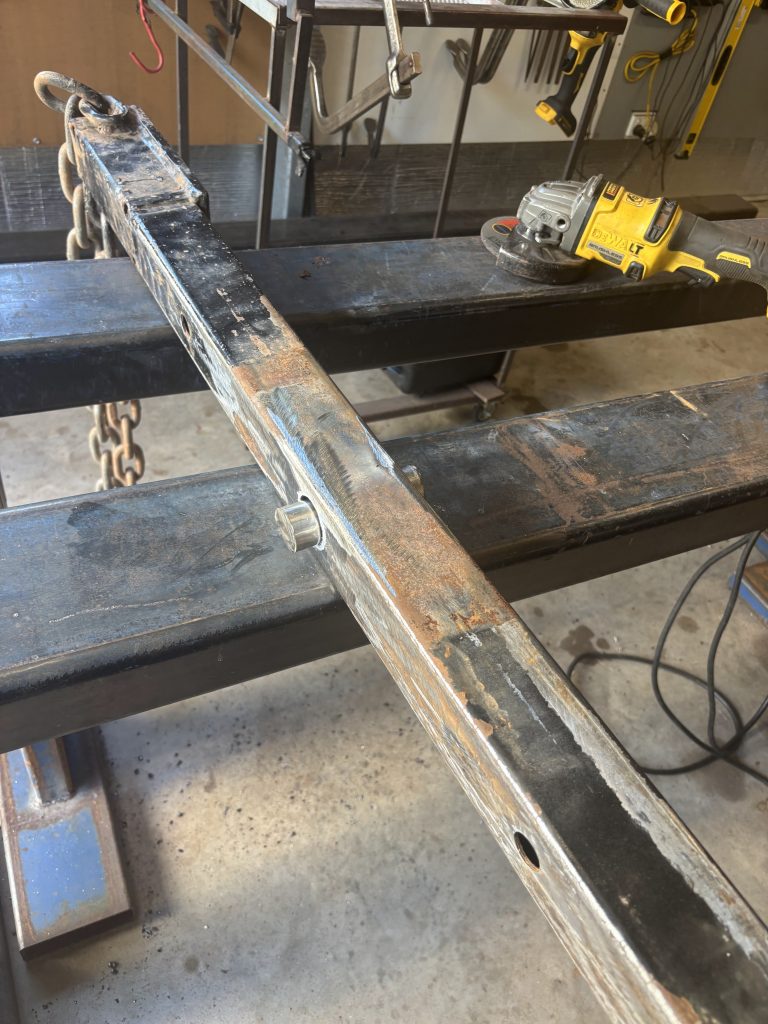 The trailer’s SHS 65×65 telescopic tube had started to crack around the locking pin hole, creating a serious weak point. We quickly assessed the damage, opened the cracks, and filled the area with a solid round bar, welding all the way around both the cracks and the new steel insert.